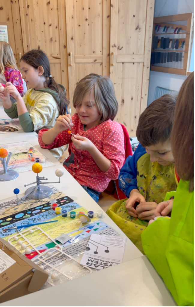Parallel dazu gestalten sie im Fach BG ein Modell unseres Sonnensystems. Mit viel Sorgfalt bemalen sie unterschiedlich grosse Kugeln passend zu den einzelnen Planeten und ordnen diese in der richtigen Reihenfolge an. Auf diese Weise vertiefen sie ihr Wissen auf kreative Art und Weise und verbinden fachliches Lernen mit gestalterischer Arbeit.